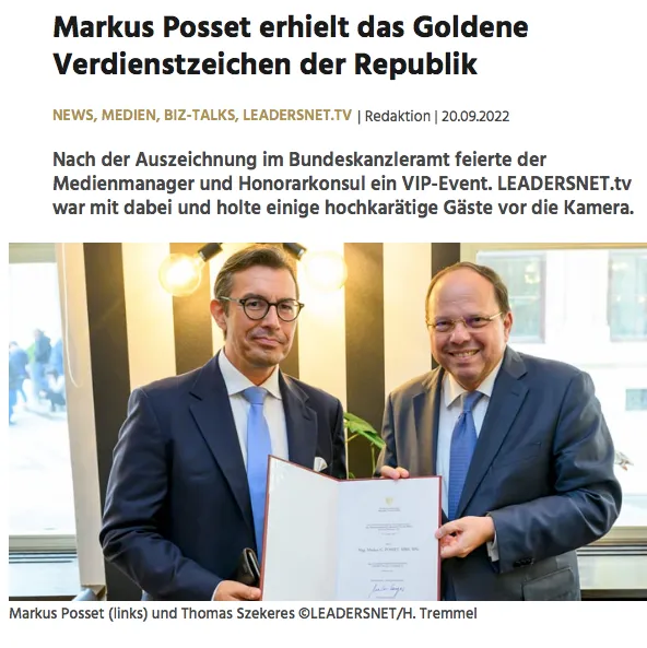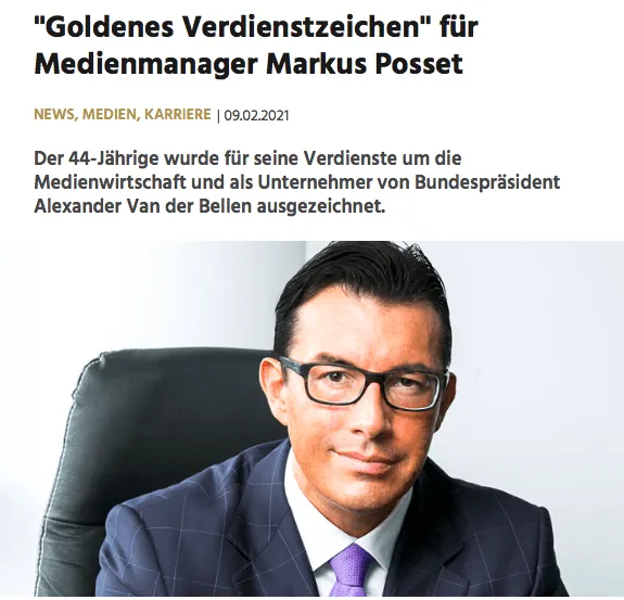 Markus POSSET wurde mit Entschließung des Bundespräsidenten vom 14. Jänner 2021 das "Goldene Verdienstzeichen seitens der Bundesrepublik Österreich" verliehen.