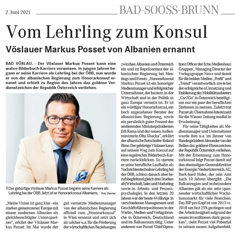 Am 5. Mai 2021 ernannte Botschafter H.E. Roland Bimo Mag. Markus POSSET, MBA MSc, mit Schreiben von Außenministerin Olta Xhaçka und Premier Edi Rama sowie Exequatur von Bundespräsident Dr. Alexander Van der Bellen zum Honorarkonsul Albaniens.